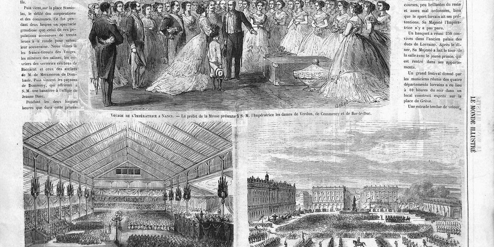 *En 1866 eurent lieu à Nancy des festivités pour la venue de l’impératrice Eugénie et de son fils, le prince impérial âgé de dix ans, à l’occasion du centenaire du rattachement de la Lorraine à la France. L’impératrice entre dans Nancy avec une robe brodée, création locale car la capitale lorraine connaît une activité soutenue en ce domaine de la broderie et vint visiter l’Institut des sourds – muets fondé par J. Piroux à Nancy. Elle devait se rendre à Jarville aux courses hippiques mais un orage en décida autrement. A une fenêtre du pavillon Alliot sur la place Stanislas, se tenait Hubert Lyautey qui décrivit le petit prince vingt ans plus tard de cette façon « si charmant dans son complet de velours, ses bas rouges et son grand cordon, escorté par de vieux soldats lorrains, survivant de l’épopée impériale. »